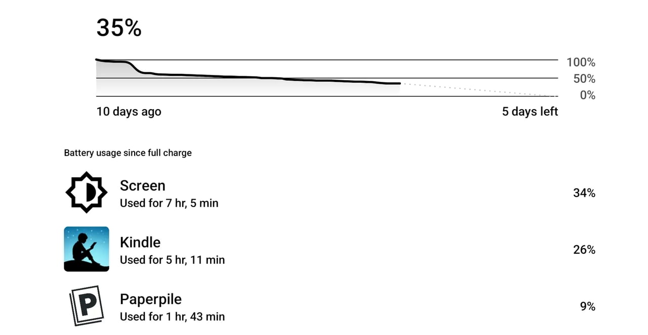 10日間のうち7時間ほど Kindle + Paperpile で読書した状態でバッテリー残量が35%となった。スリープ状態でのバッテリー消費はほとんどない。これは素晴らしい。