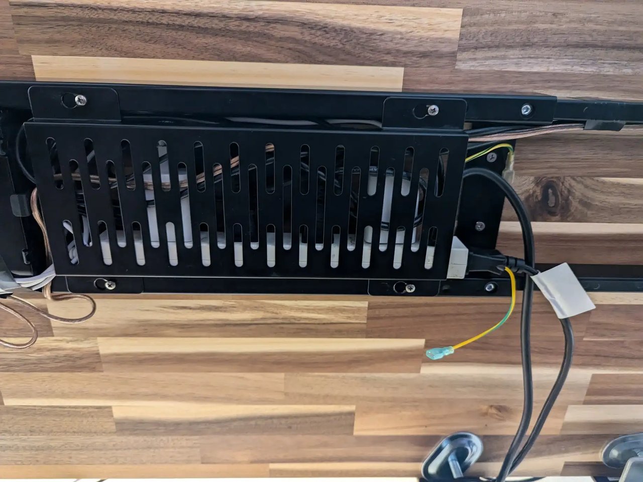 今回天板を交換するついでに配線まわりも整理した。 現在使っている昇降デスクは左右の脚にモーターがついていて、天板の上下を制御できる。 左右に電力供給するためにケーブルが伸びているのだけれど、このケーブルが垂れ下がってしまい見た目が良くなかった。