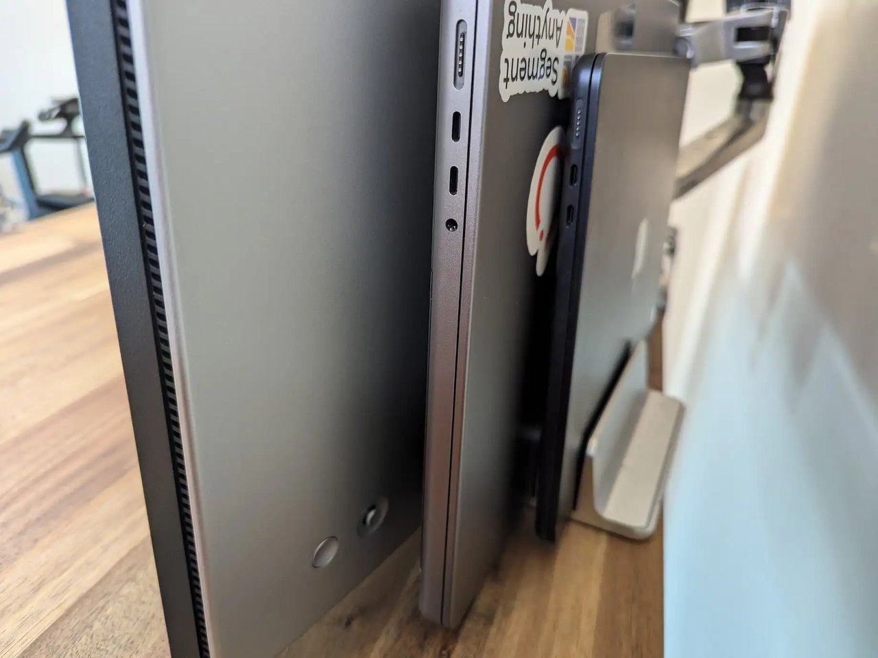PCはノートPCをディスプレイの裏側に縦置きしている。デスクトップPCを使っていたときはホコリ掃除が大変だったのだけど、ノートPCを使うようになってからはホコリ掃除が楽になった。地面に何もないので掃除機でスぃーとするだけ。仕事用の M3 Macbook Pro と趣味用の M2 Macbook Air が並んでいる。PC台の土台の片方をディスプレイに引っ掛けているので、台からPCが落ちる心配もなく安定している。