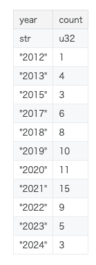 Meta Kaggle を用いて MLE-Bench に含まれるコンペティションがいつ開催されれていたものなのかを集計しました。 2021年が件数として一番多いですが、2012年から2024年までの12年間のコンペティションが含まれていることがわかります。