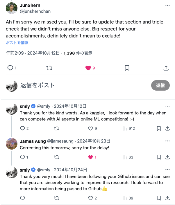 後発の研究者が”オンライン”のKaggle competition、つまり現行のコンペティションにおいて優れた成果を出したときこそ真価が問われます。そうした後発の研究者が適切な称賛を受けてくれたら良いなと思います。 AI Agent が今後さらなる発展を遂げることを楽しみにしています。
