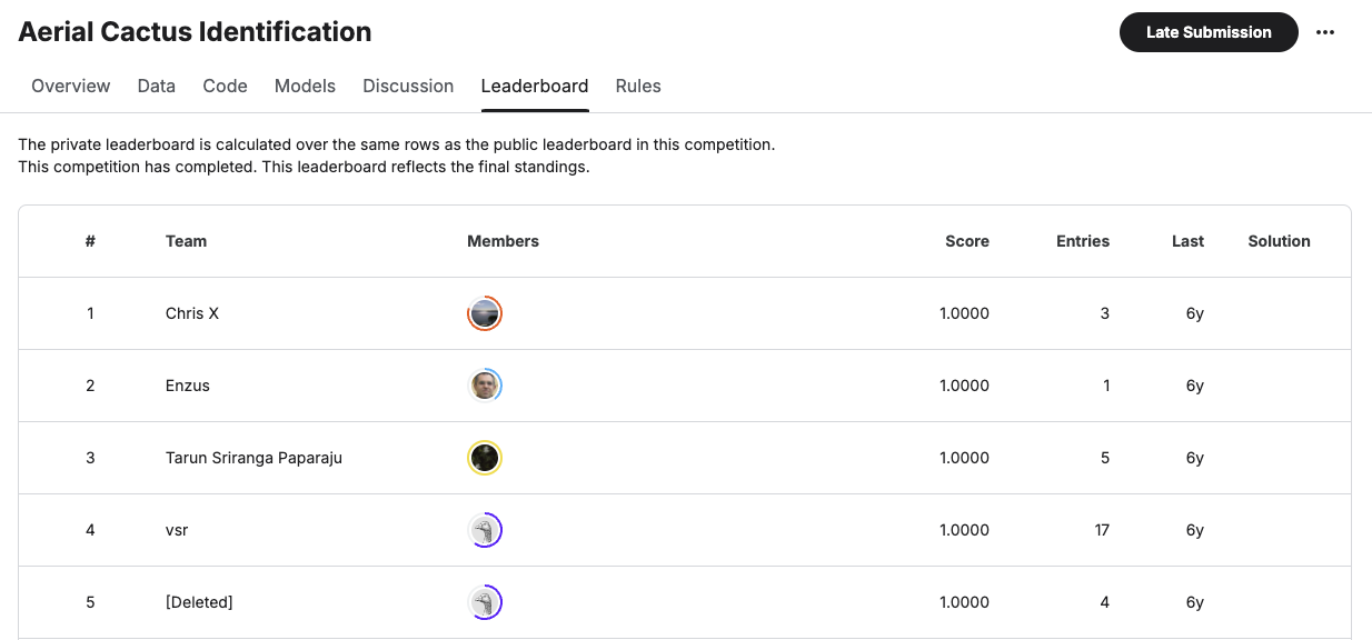 以下の Aerial Cactus Identification コンペは MLE-Bench に含まれている練習用コンペの一つです。100名以上のユーザーが AUC=1.0 を達成しています。 これは Codes を見ると明らかなのですが、非常に短い CNN のコードを実装するだけで 1 位相当のスコアを達成できます。 MLE-Bench に含まれている別の練習用コンペである Leaf Classification コンペも同様に 20 人以上の logloss が 0.0 となっています。 これも非常に簡単なコードで解ける問題です。
