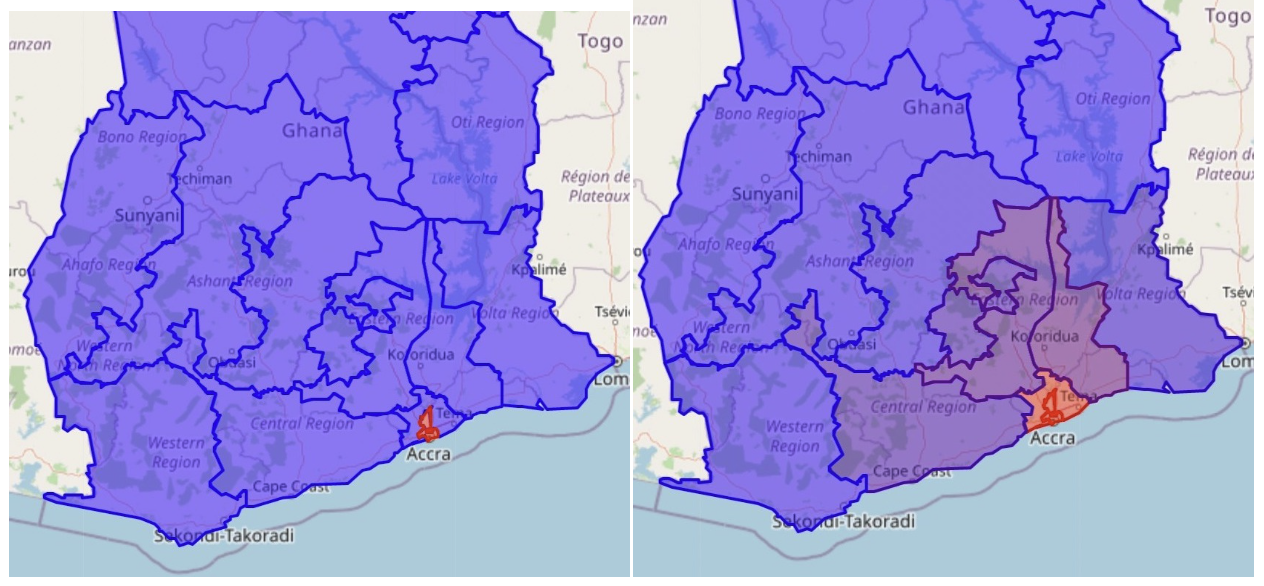 これは日本に置き換えて考えるとadmin1は都道府県レベルの行政境界、admin2は市区町村レベルの行政境界。admin2は10 km^2の台東区や905 km^2の広島市など様々な広さの違いがある。マージの制約は単一のgeocellに複数の都道府県をまたぐことはないことを意味している。
