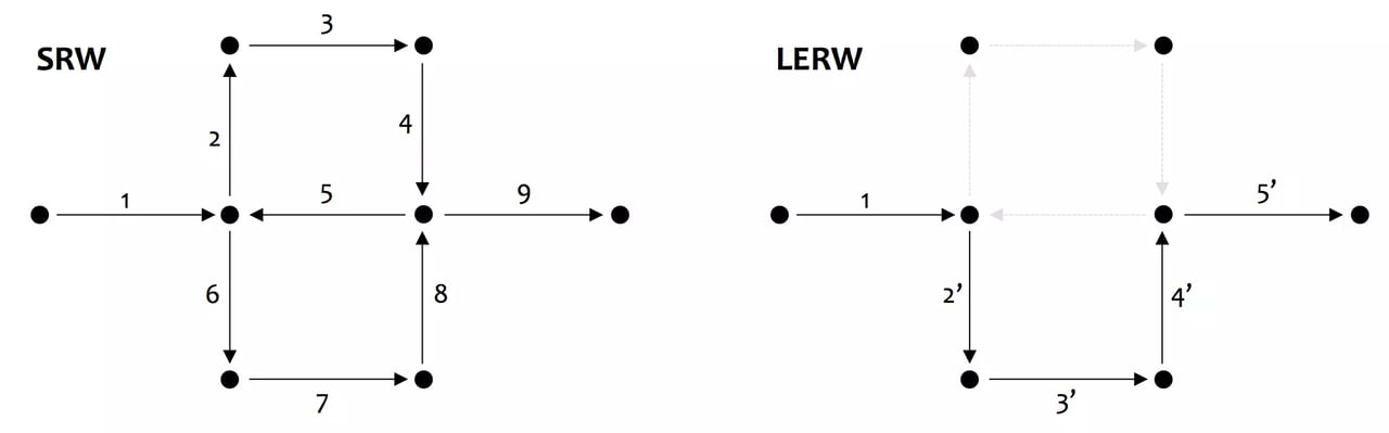 普通の単純ランダムウォーク (SRW) をグラフ上で実行した場合,そのパスはループ(閉路や多重辺)を生成する可能性がある。これに対して,ループ除去ランダムウォーク (LERW) は SRW からループが発生した時系列順にループを除去することで,ループのないパスを生成する。