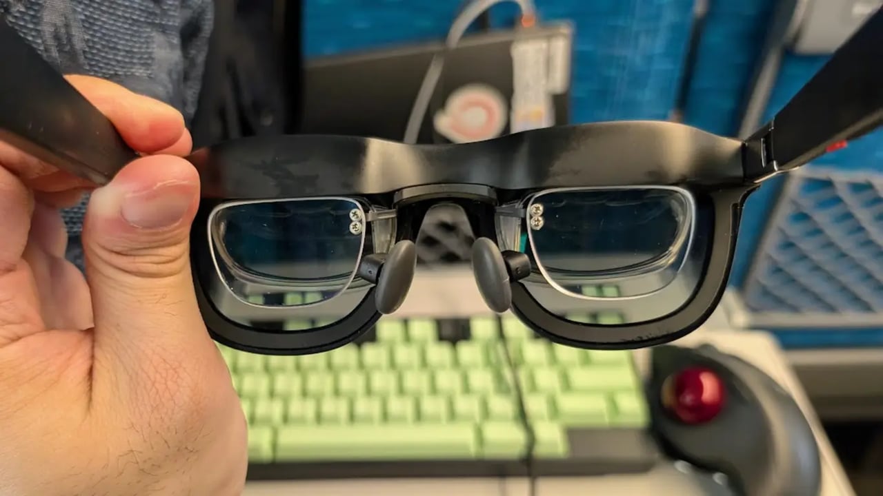 XREAL One はメガネ型の外部ディスプレイとして動作するスマートグラス。USB-C で接続することで PC 画面を拡張表示することができる。本体重量が約82gであるため比較的軽量であり、長時間の使用にも疲れにくい。また専用のメガネフレームを購入してレンズ加工を依頼することで、度付きレンズの装着が可能になっている。